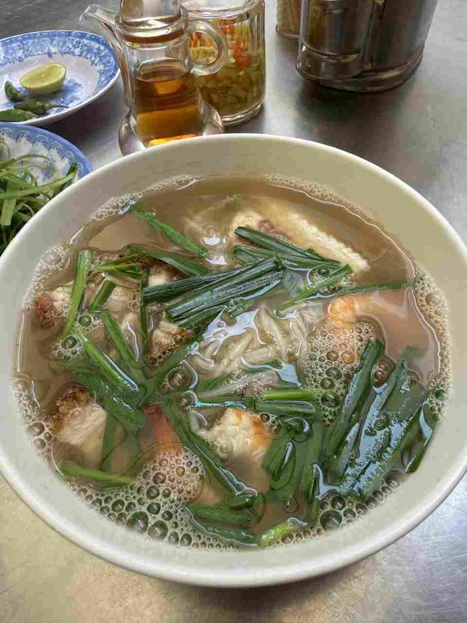 Tô bún nước lèo Sóc Trăng đặc biệt với nước dùng mắm đặc trưng, topping đầy đặn gồm cá, tôm và thịt, ăn kèm rau tươi. Phù hợp cho bữa sáng hoặc bữa ăn no bụng.